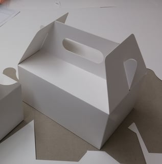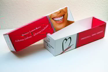 bestehend aus Ober- und Unterdeckel, komplett mit Glanzfolie kaschiert, um Feuchtigkeit fern zu halten. Konzipiert als Transportbox für ein Dental-Labor.