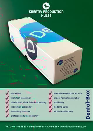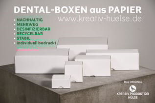 Wir haben für Sie Dental Boxen aus Papier entwickelt, die genau zu Ihren Bedürfnissen im Dentallabor passen. Wir haben aktuell Dental Boxen in 11 verschiedenen Formaten und Größen, angefangen von Dentainer-S, Dentainer-XL, Dentainer XXL, Dentainer 1er4, Dentainer 1er8, Dentainer 2er, Dentainer 3er und weitere Größen. Die Dental Boxen lösen Ihre Plastiktüten ab und sind desinfizierbar, wiederverwendbar, nachhaltig und recyclebar.