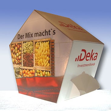 in Pentagrammform mit Schütte (innenliegend) zum Befüllen mit Bonbons oder auch anderen Inhalten geeignet. Die Box wird für die Kunden sichtbar und verfügbar auf Kundentresen zur Selbstbedienung aufgestellt.